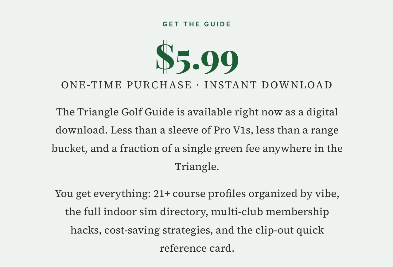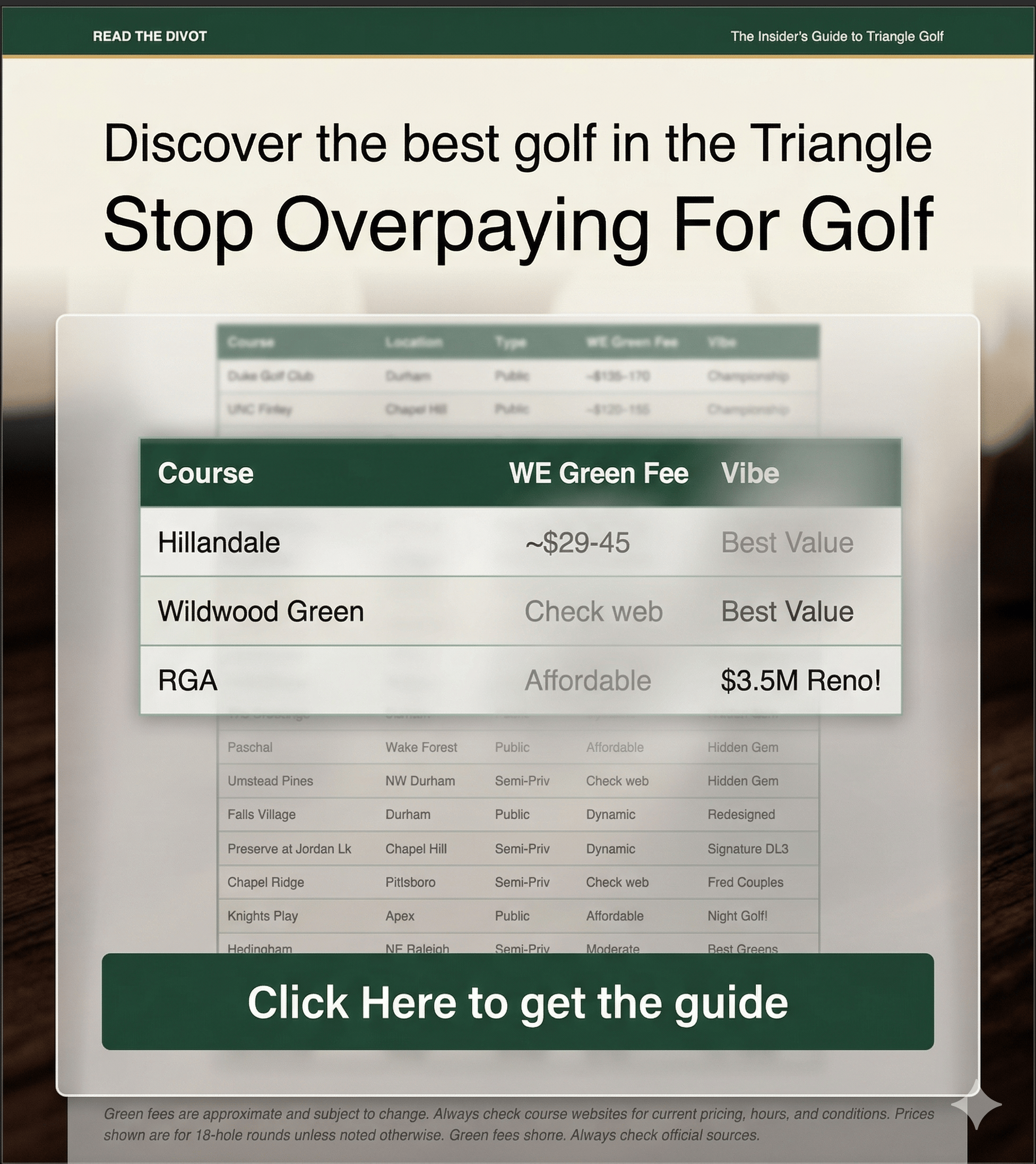 That's why we built the Triangle Golf Guide. It's the local playbook we wished existed when we started covering this area every week for Read The Divot. No filler. No generic "top 10" padding. Just the real intel on where to play, where to practice, and how to make it all more affordable.