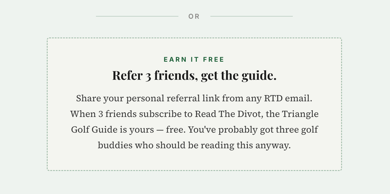 Read The Divot is a weekly golf newsletter covering tour news, gear, and local Triangle course intel every Monday. We're built for golfers in the Raleigh-Durham-Chapel Hill area who want more than national headlines — we cover the courses you actually play. Subscribe free at readthedivot.com.